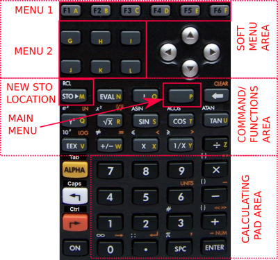 There are 3 rows of keys with various functions. Most keys work just as expected per the functions painted on them. Some keys have a new behavior, however. Some of the most important keys are M, which has the STO/RCL functions relocated since the K key is now part of the Menu 2 keys, and the P key which presents the Main Menu on the currently active menu (see Working with the menus).